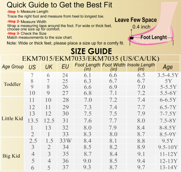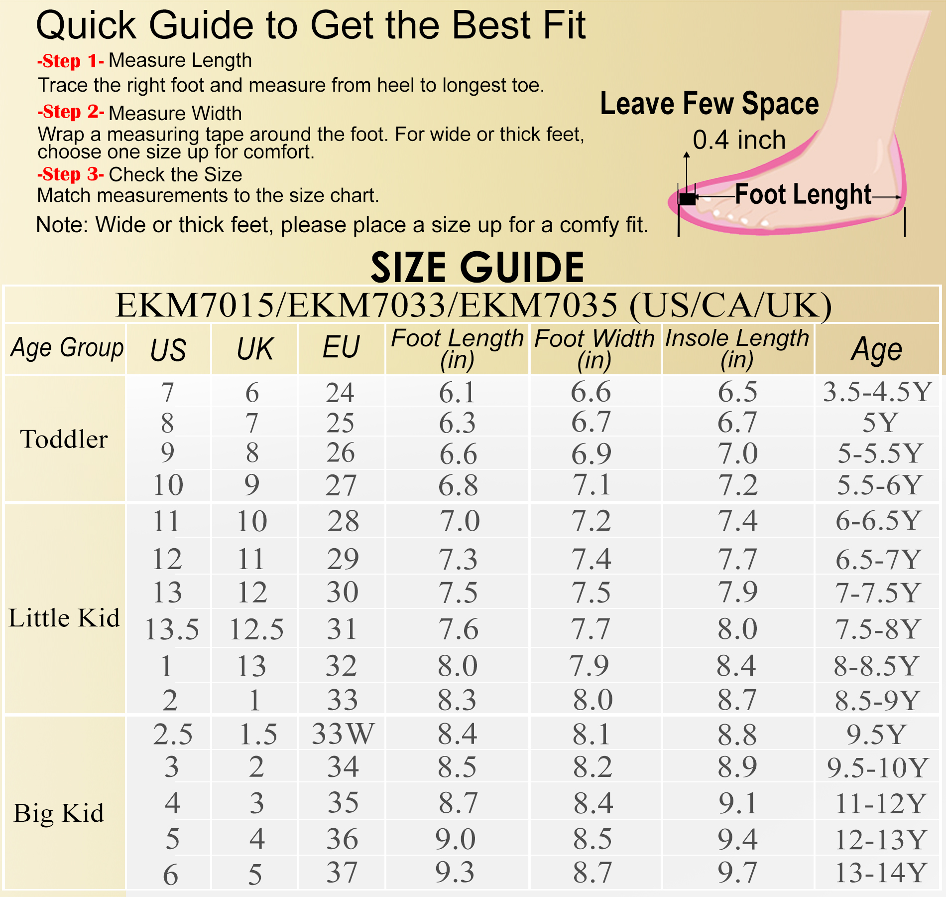 Size | EU24=US7=UK6, EU25=US8=UK7, EU26=US9=UK8, EU27=US10=UK9, EU28=US11=UK10, EU29=US12=UK11, EU30=US13=UK12, EU31=US13.5=UK12.5, EU32=US1=UK13, EU33=US2=UK1, EU33W=US2.5=UK1.5, EU34=US3=UK2, EU35=US4=UK3, EU36=US5=UK4, EU37=US6=UK5 |